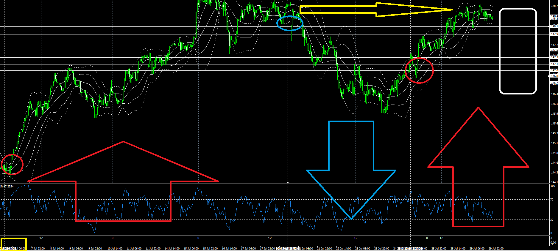 白□の複数水平線は、記事にしている1時間足億トレラインです。
