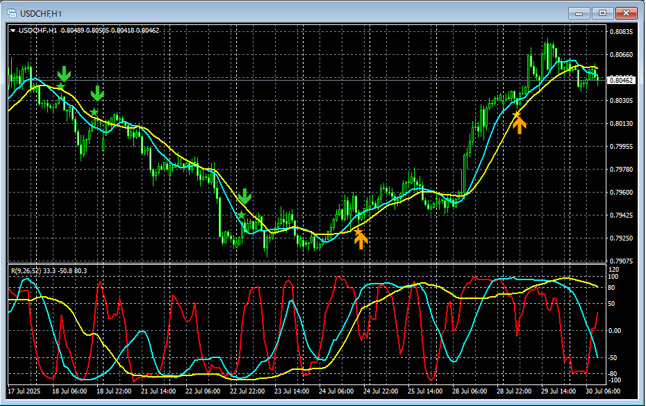 百戦錬磨FX【RCIを極めて移動平均線フィルターで勝つ!! ドルスイス 1時間足】mBDSRのサイン