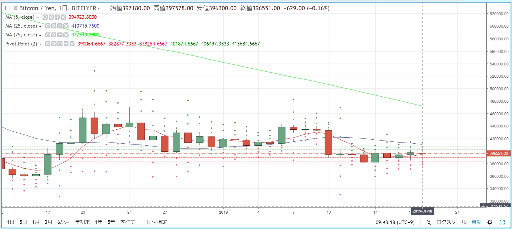 画像は2019年1月19日のキャプチャ。前日は弱めの調整的な、凪の動きに終始していました。その流れが継続して、今日も凪の動きになっています。ビットコインをはじめとする主要どころは-1%~1%の幅です。