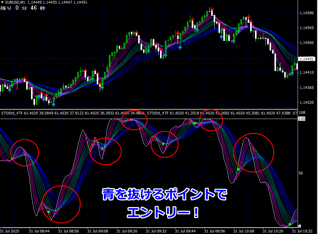 インジケーターの帯はピンク・緑・青の3層構造で、3層の帯は、収斂と拡散を繰り返しますので、 上昇時は、上から ピンク・緑・青 の並びとなり、下落時は、その逆で、上から青・緑・ピンクの並びになります。