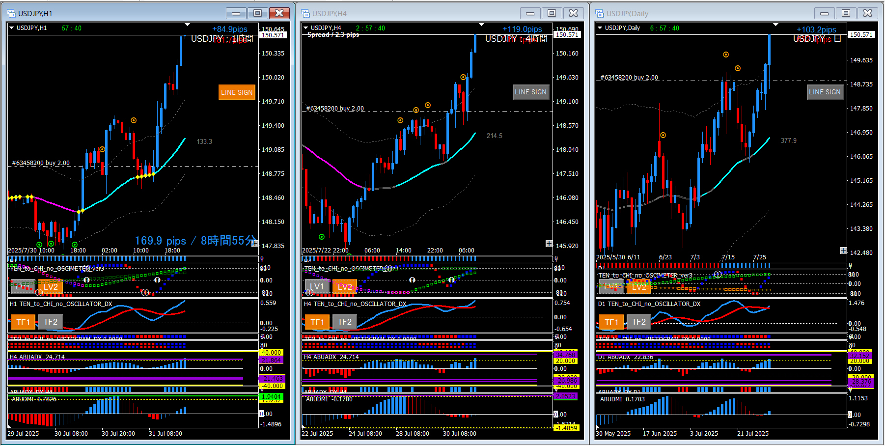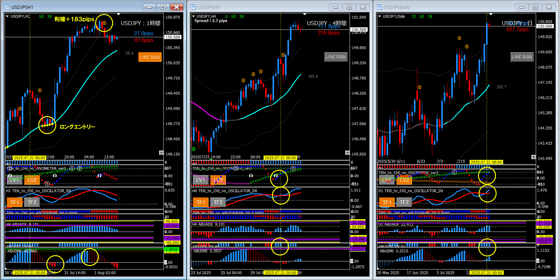 【2025年8月1日】一撃180pips!天と地のインジケーターのデイスイング手法検証(ドル円)