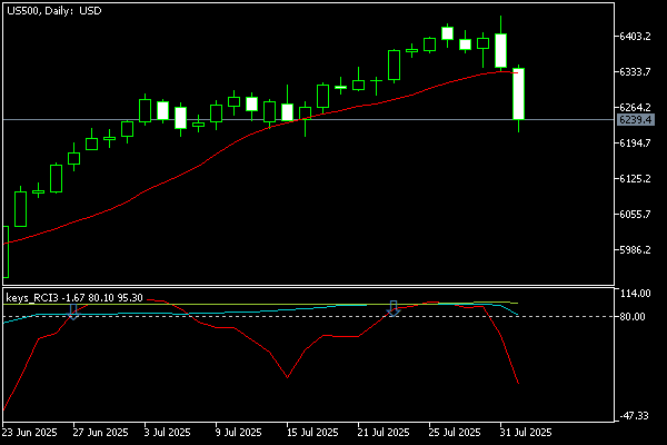 S&P500は第5週に6388.64まで上昇し、過去最高値を更新しました。RCI短期9は高値圏で横ばい、中期26は上昇継続、長期52も強い上昇トレンドを維持しています。企業決算の好調さと通商合意への期待が相場を支えました。