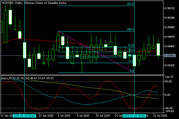 NOK/SEKは週を通じて0.9450〜0.9530の間で推移し、やや強含みの展開となりました。RCI短期9は上昇基調を維持し、中期26もプラス圏で安定、長期52は底打ちから反転の兆しが見られます。ノルウェーの経済指標が堅調で、クローナ買いが優勢でした。