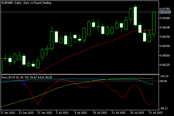 EUR/GBPは7月第5週にかけて0.8640〜0.8730のレンジで推移しました。日足RCIでは短期9が高値圏から下落し、中期26はピークアウトの兆し、長期52は上昇基調を維持しています。ユーロ買いの流れが一服し、ポンドの底堅さが目立つ週となりました。
