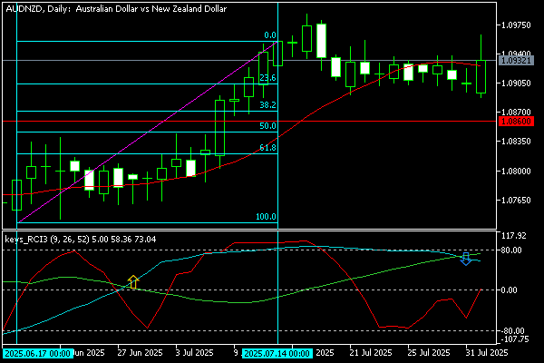 2025年7月第5週のAUD/NZDは、週初に1.0910付近で推移し、週末にかけてやや軟調な展開となりました。RCIでは短期9がプラス圏から徐々に下落し、中期26は横ばい、長期52は依然としてマイナス圏で推移しており、上昇の勢いは鈍化しています。RBAの利下げ観測が豪ドルの重しとなり、NZドルとの金利差縮小が意識されました。