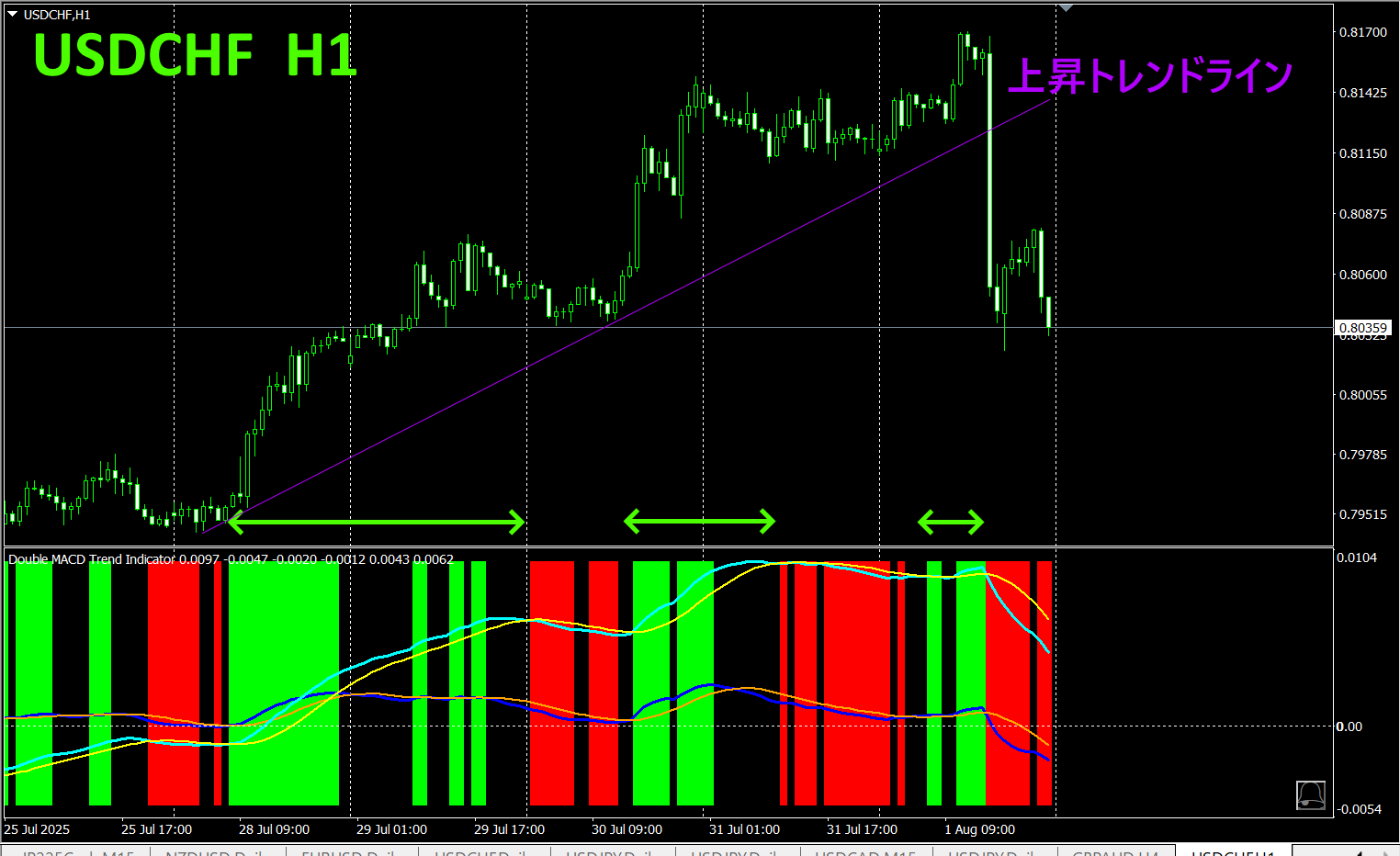 USDCHFは、右肩上がりの上昇トレンドになっているので、インジケータのカラーが緑になったら買い、赤になったら決済を繰り返すだけです。レートが上昇トレンドラインを割ってくるまで、単純に繰り返すだけで利益が得られます。
