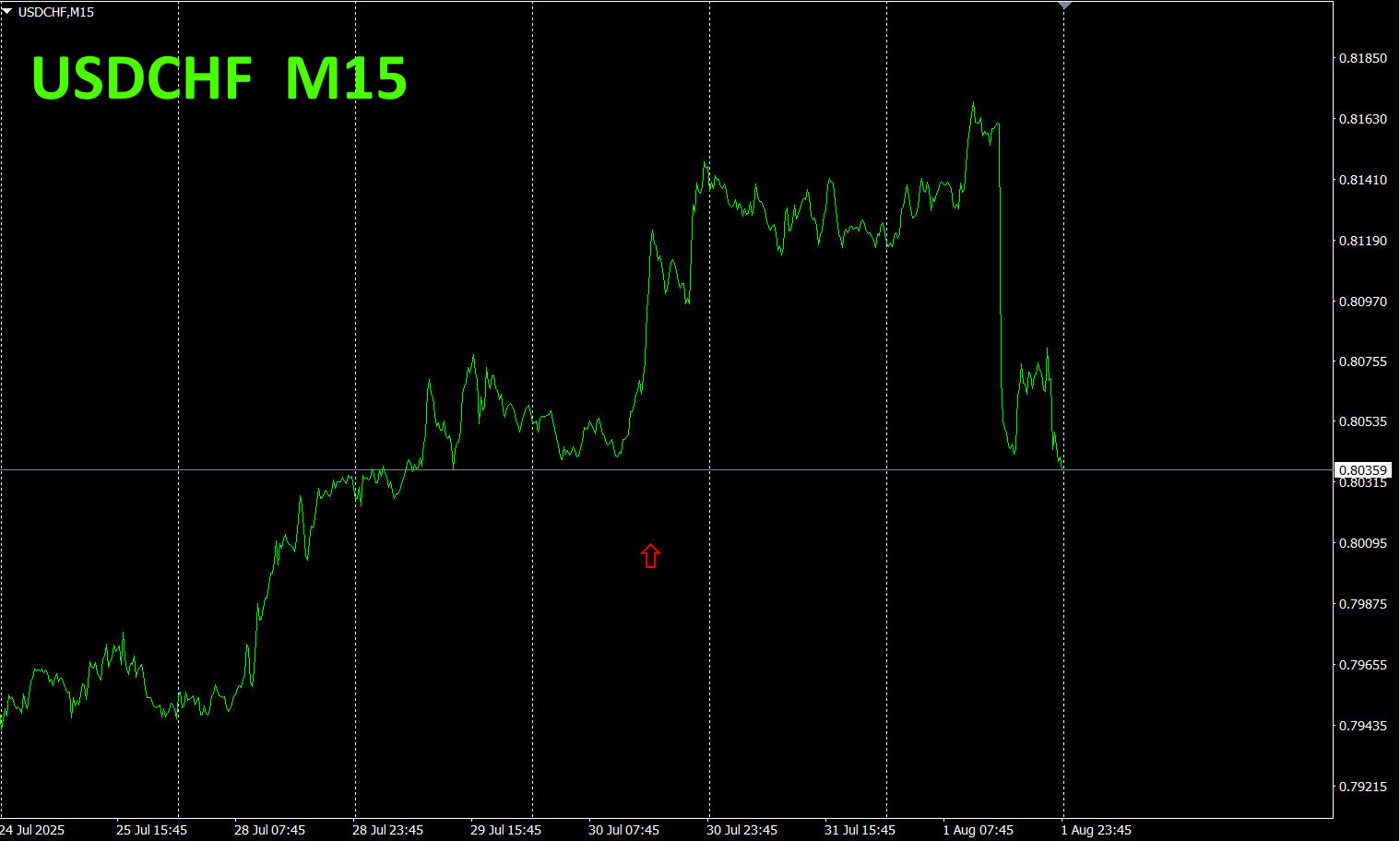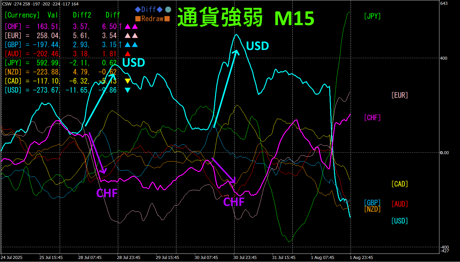 15分足の通貨強弱グラフを見ると、USDとCHFが、見事な逆相関関係になっていることがわかります。今一番大きく伸びていて、逆相関関係にある通貨ペアを選びトレードすれば、自ずと結果が付いてくるのです。