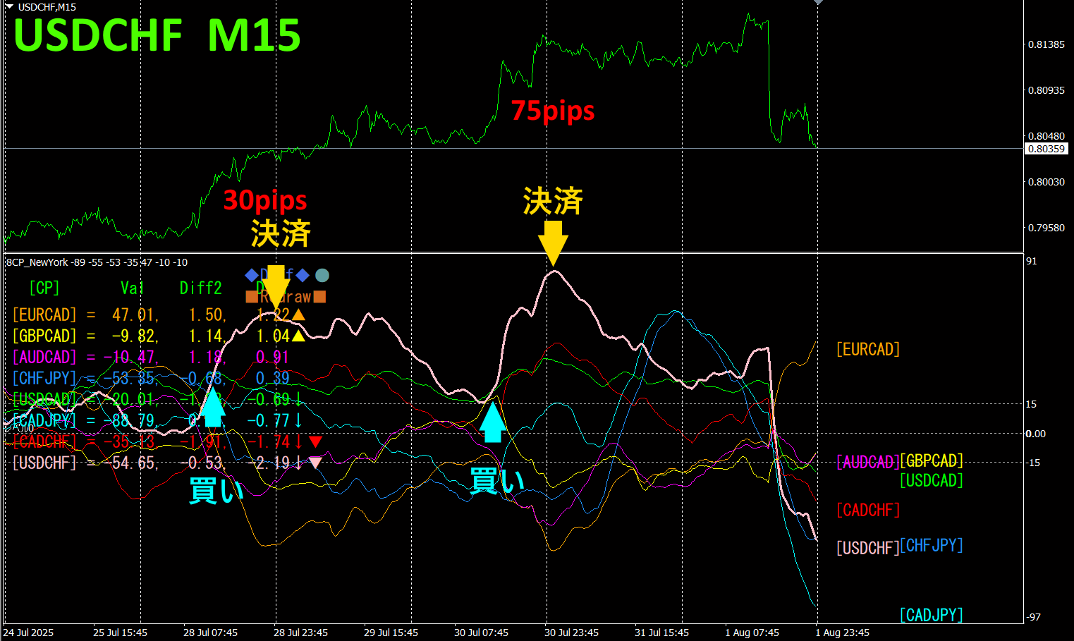 上半分は、USDCHFの15分足チャートです。下半分は、「8CP見える化インジケータ」によるものです、ピンク色太線のグラフがUSDCHFに相当します