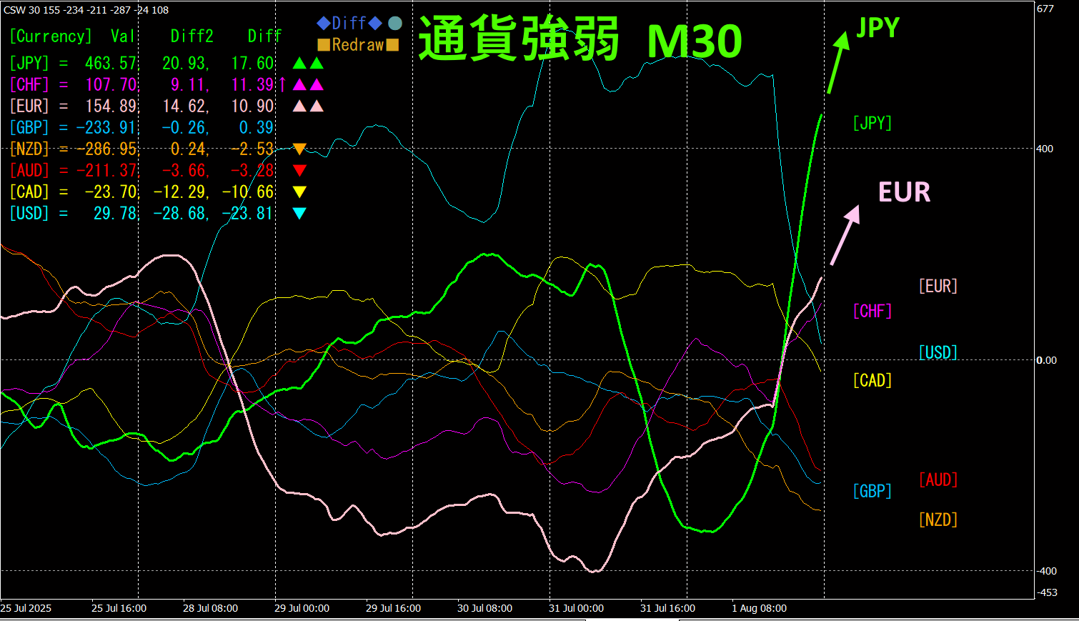 ピンク色がEUR、緑色がJPYです。チャート上では、EURもJPYも、急角度で序章しています。JPY > EUR なので、EURJPYは下方向になるのですが、この週末の動きは、あまりに急すぎるので、今後の展開が読めません。一応、下落方向としておきます。