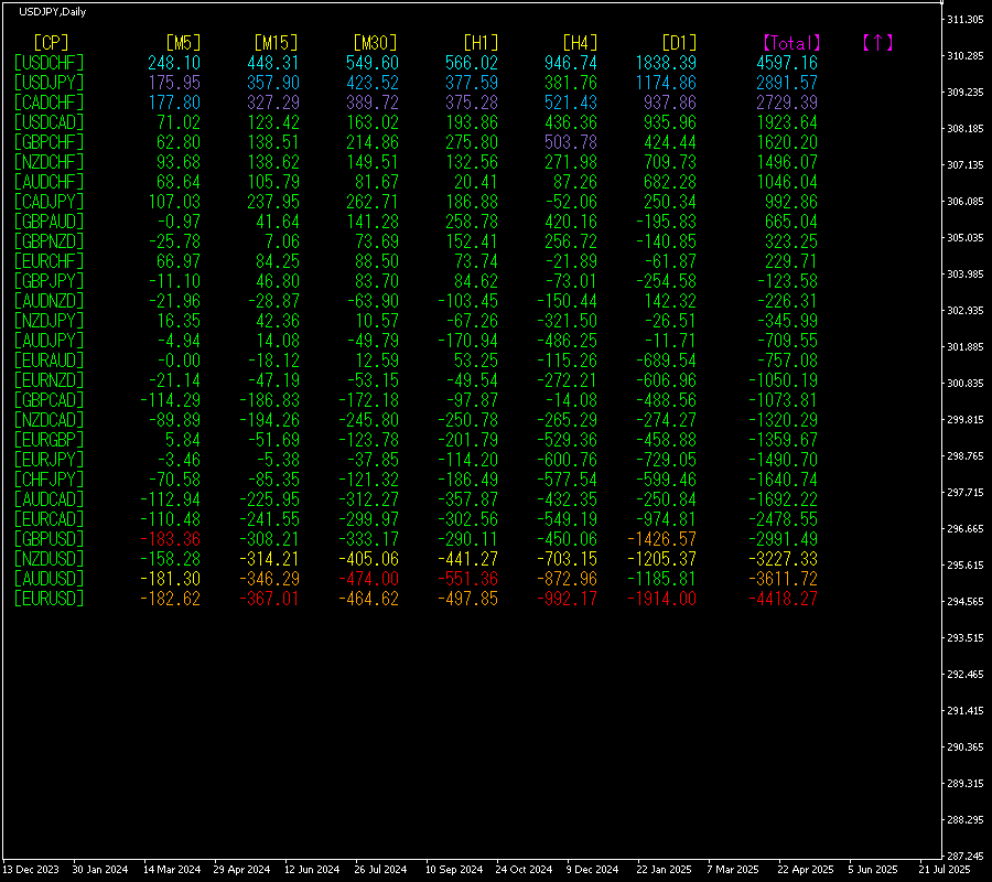Total]数値の降順に並んでいます。一番上にあるUSDCHFは、全ての時間足で青色の表示色になっています。Total数値が+4597.16と、大きいプラスの数字になっています。USDCHFに著しい上昇トレンドが発生していることが示されます。