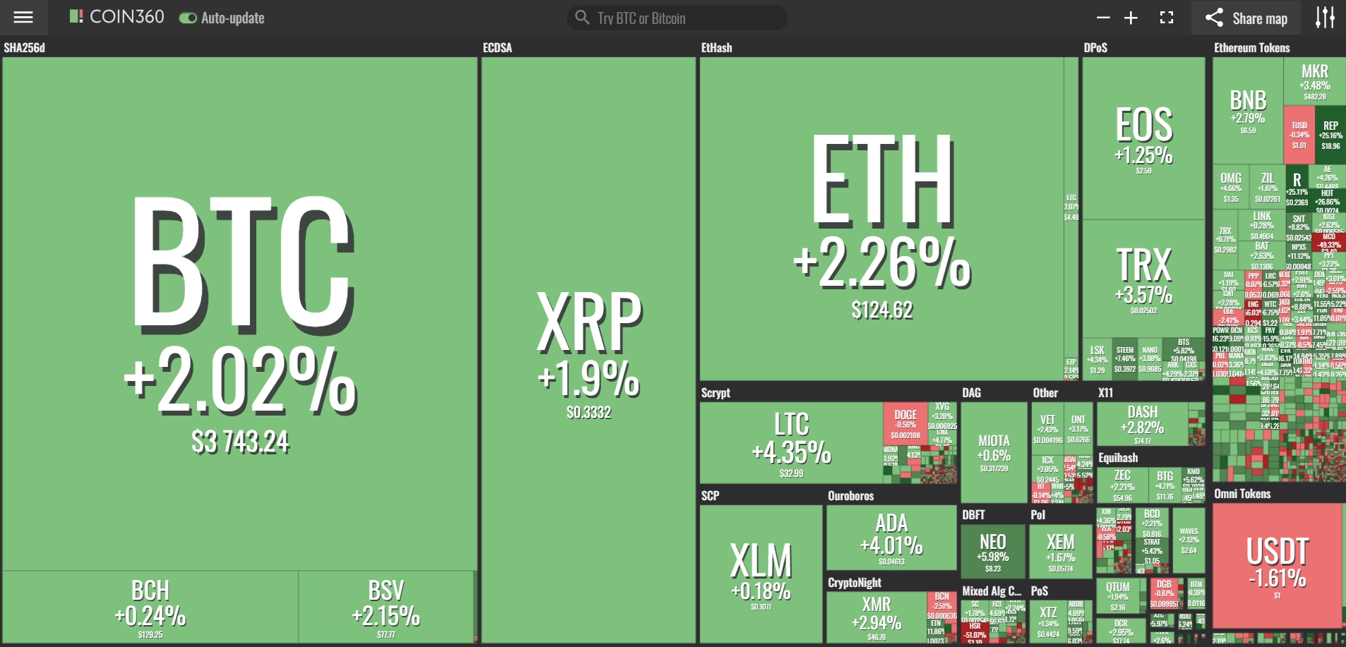 coinmarketcap(コインマーケットキャップ)のサイトから、ドミナンス(各銘柄が仮想通貨全体の時価総額に占めるパーセンテージ)を定点観測していきます。仮想通貨全般が下方向に大きく動き出している相場状況を受け、毎日更新することとし、仮想通貨業界を俯瞰および転換期を早期に発見することを目的とします。