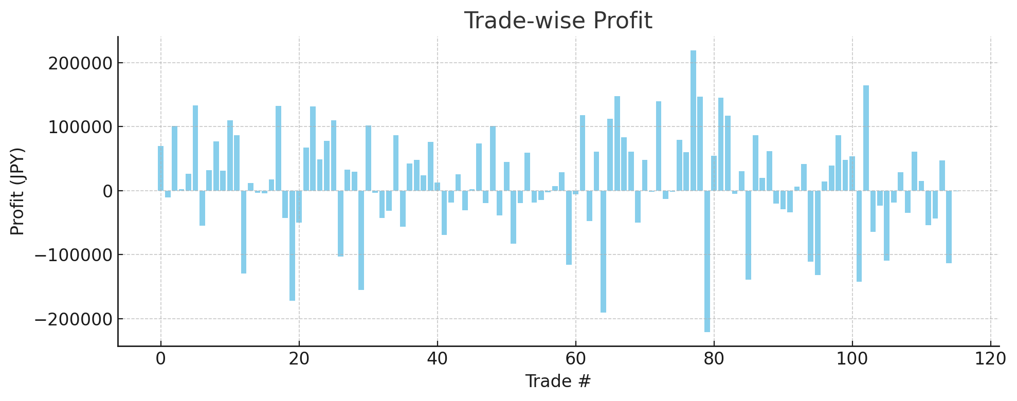 | 勝率の安定性に若干の波がある | 全体の勝率は50%を超えているものの、安定性には欠け、連敗による資金減少の可能性がある。 | 勝率の低下が起こるタイミングを特定し、フィルタ条件やロジックの強化を検討する。 |