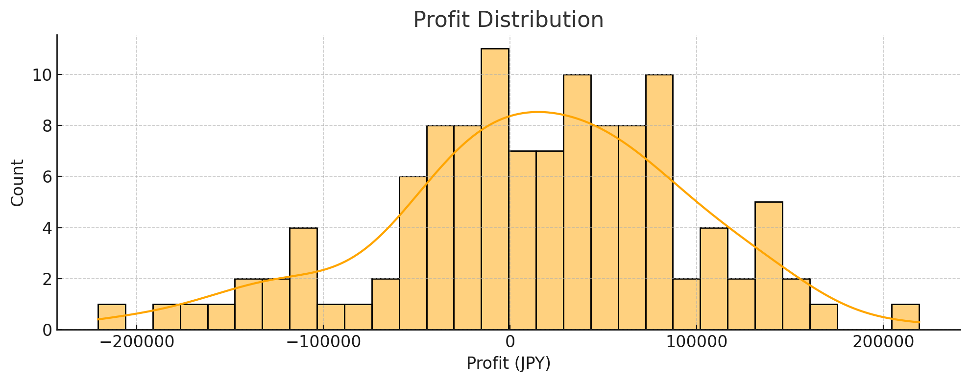 分布はやや右に偏っており、利益側に厚みがあります。リスクリワード比のバランスは良好です。