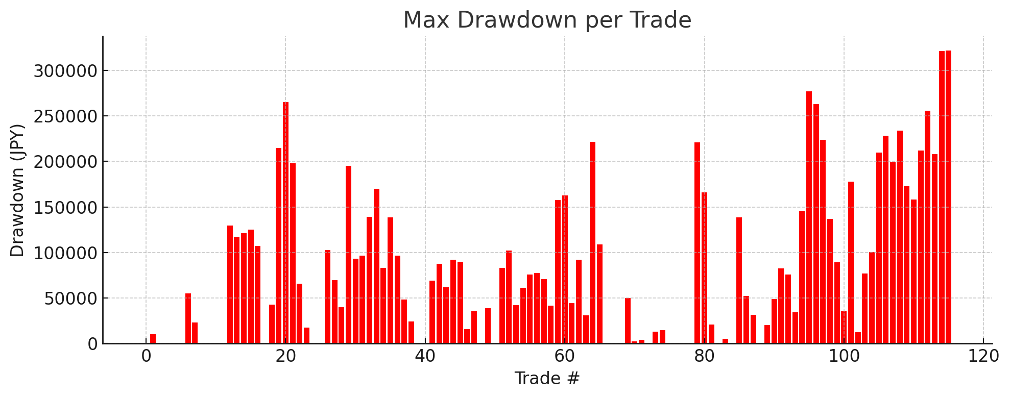 | 最大ドローダウンの発生 | 最大ドローダウンが -321,600円 (-16.91%) と比較的大きい。 | トレーリングストップやポジションサイズ制限の導入により、リスクを動的に抑制する。 |