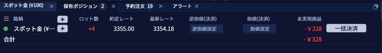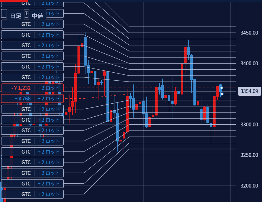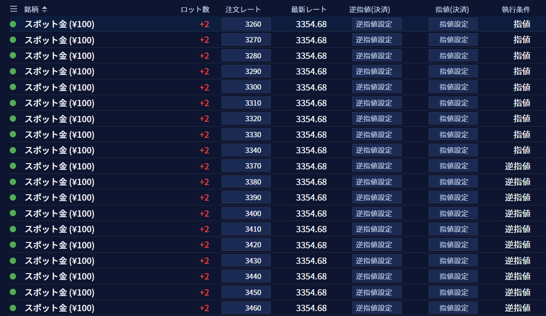先週金曜日の株価指数大幅下落に伴って、安全資産の金相場が上昇し、買い条件が整いました。3260~3460間に10ドル刻みで買い注文を立てています