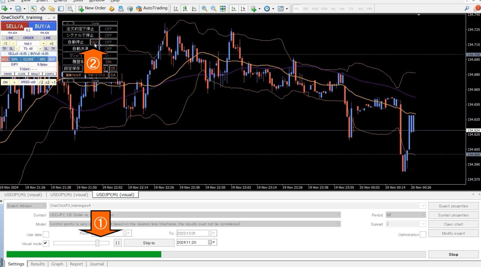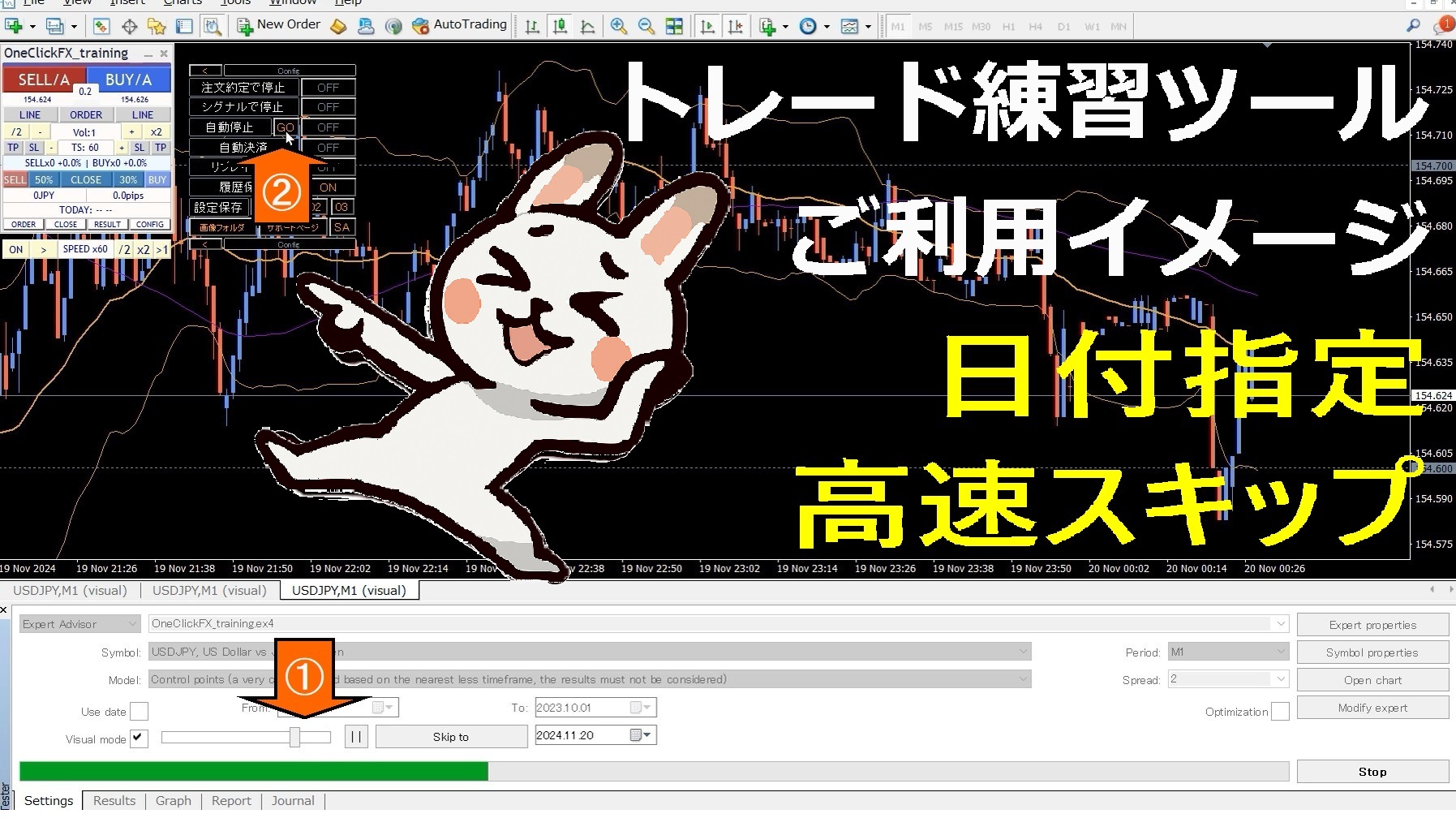 日付を指定してチャート上の特定の日付まで一気にスキップする方法について解説します。ワンクリックFXトレーニングの高速スキップ機能とMT4ストラテジーテスターのスキップ機能を組み合わせることで、指定の日付まで移動します。トレードシミュレーションや検証時に、必要な時間帯にすぐアクセスしたい場合に便利です。