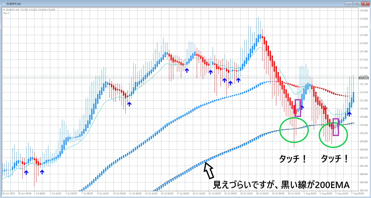 しかし、タッチだけでエントリーをすると、一時的に下落して狩られることがあるので、