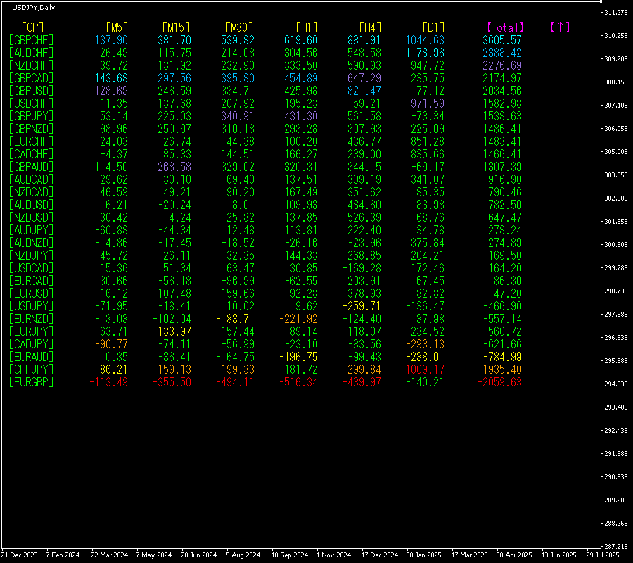 [Total]数値の降順に並んでいます。一番上にあるGBPCHFは、全ての時間足で青色系の表示色になっています。Total数値が+3605.57と、大きいプラスの数字になっています。GBPCHFに著しい上昇トレンドが発生していることが示されます。
