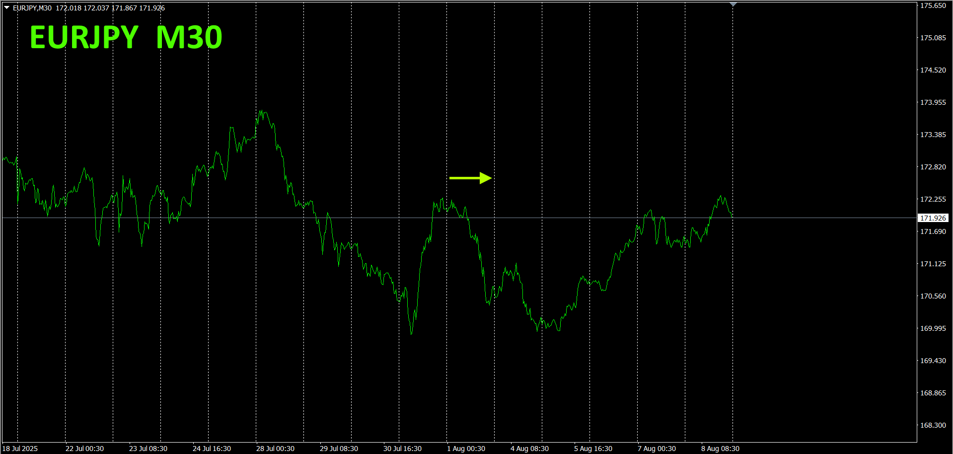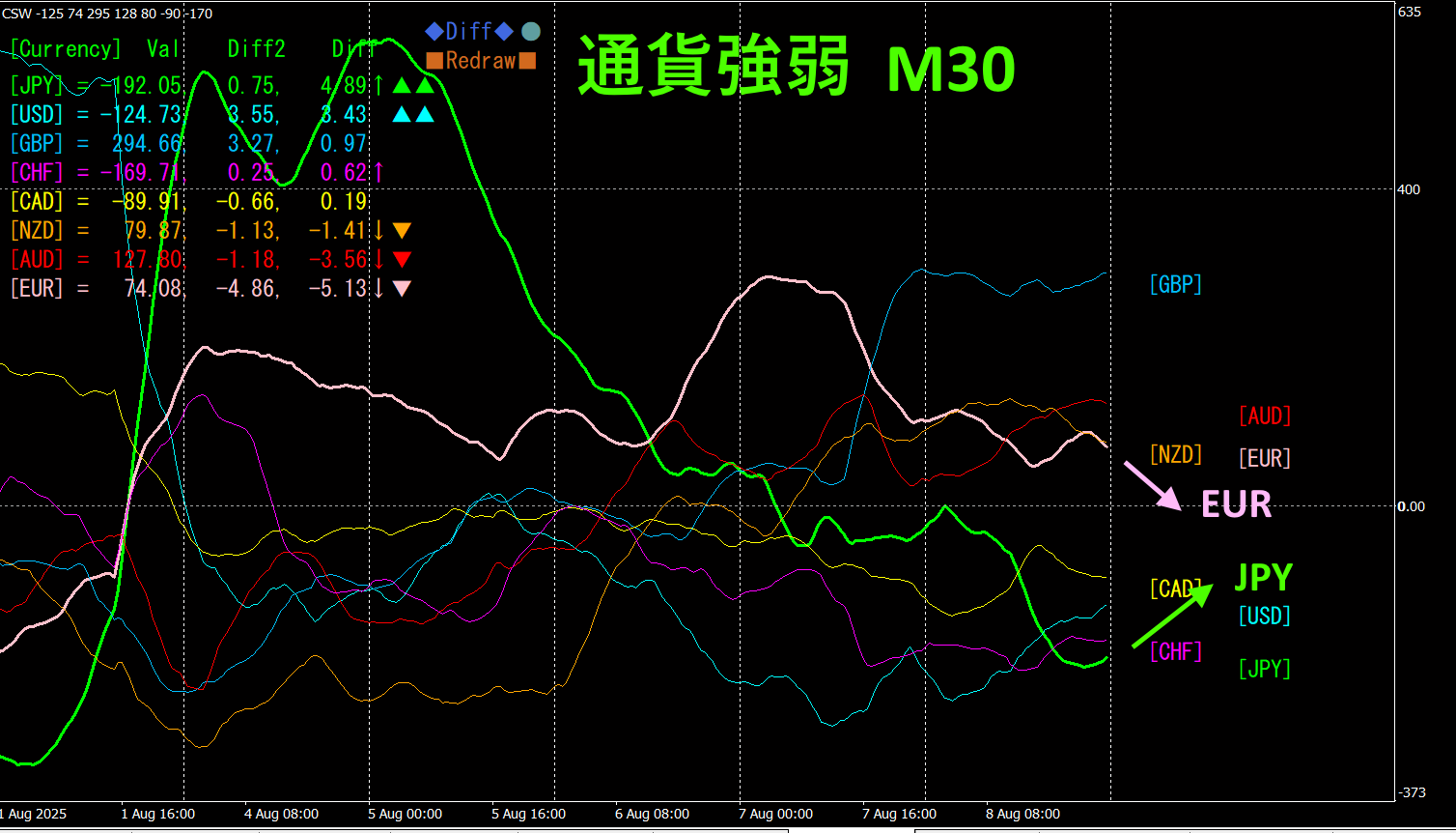 ピンク色がEUR、緑色がJPYです。M30チャート上では、EURは下向き、JPYは上向きになっているので、EURJPYは下落方向に進むと考えられます。