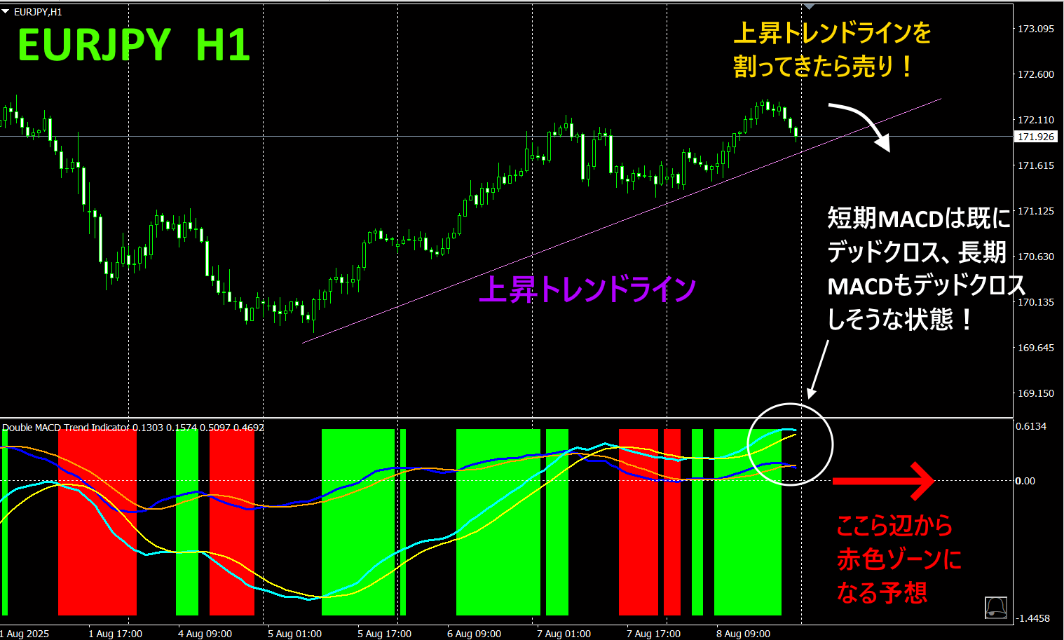 EURJPYは、今は上昇トレンドになっていますが、そろそろ上昇トレンドラインを割り込みそうです。前述の「通貨強弱チャート」でも、EURJPYは下落方向を示唆していましたが、「Dual_MACD_Trend_Indicator」を使えば、さらに相場状況が見えてきます。 次にこのインジケータのカラーが赤になったら売りエントリーし、緑になったら決済するだけです。