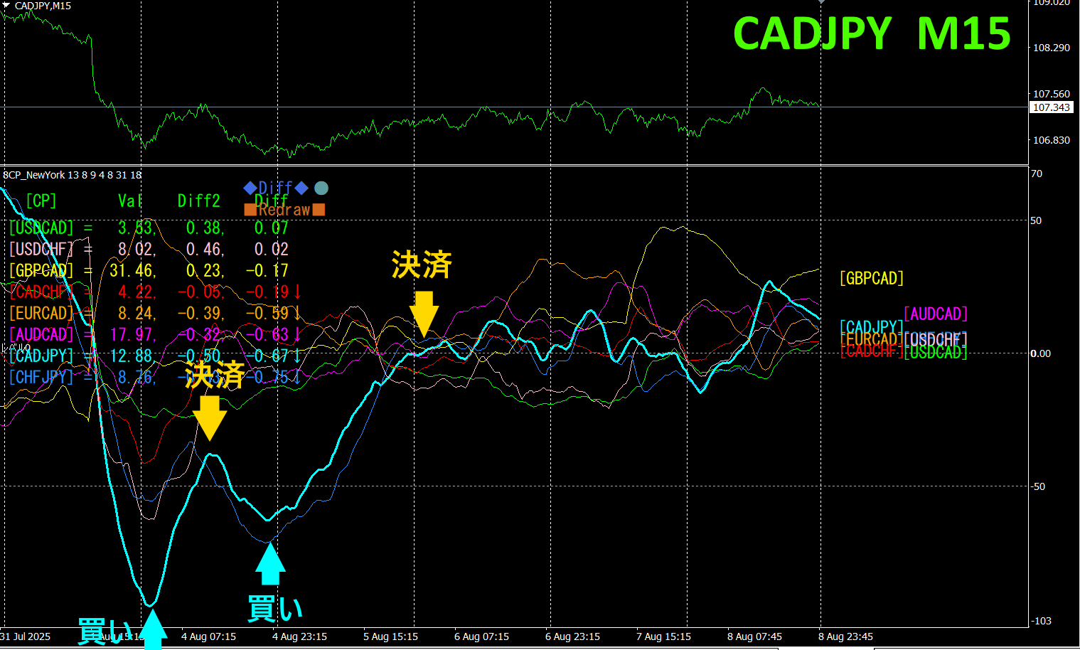 上半分は、CADJPYの15分足チャートです。下半分は、「8CP見える化インジケータ」によるものです、水色太線のグラフがCADJPYに相当します
