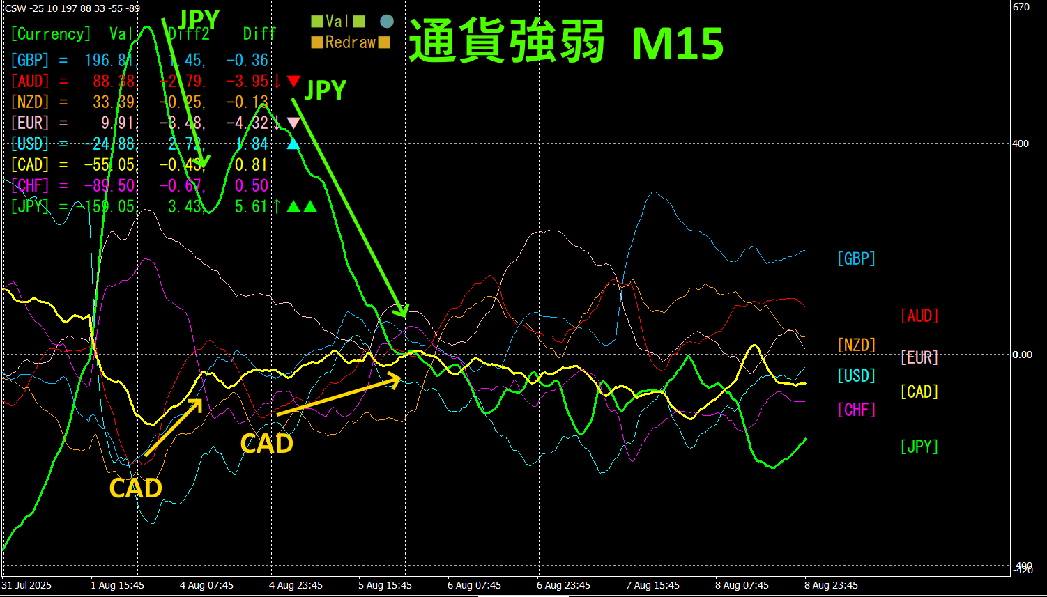 15分足の通貨強弱グラフを見ると、CADとJPYが、見事な逆相関関係になっていることがわかります。CADとJPYが拡散から収束に向かう時が、CADJPYを買う絶好の条件になっています。今一番大きく伸びていて、逆相関関係にある通貨ペアを選びトレードすれば、自ずと結果が付いてくるのです。