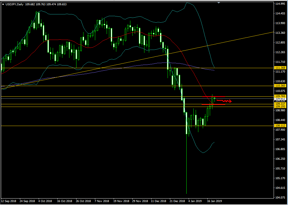 ドル円の日足チャートから見てみます。ドル円日足では、やはり先日の予想通りドル円109.765円の強めと思われるレジスタンスラインを下から上へ抜け切る事が出来なかったので、ドル円109.765円のレジスタンスラインと109.337円のサポートラインの間でレンジ状態となりました。しばらくはこのドル円109.765円のレジスタンスラインと109.337円のサポートラインの間を推移するものと予想されます。