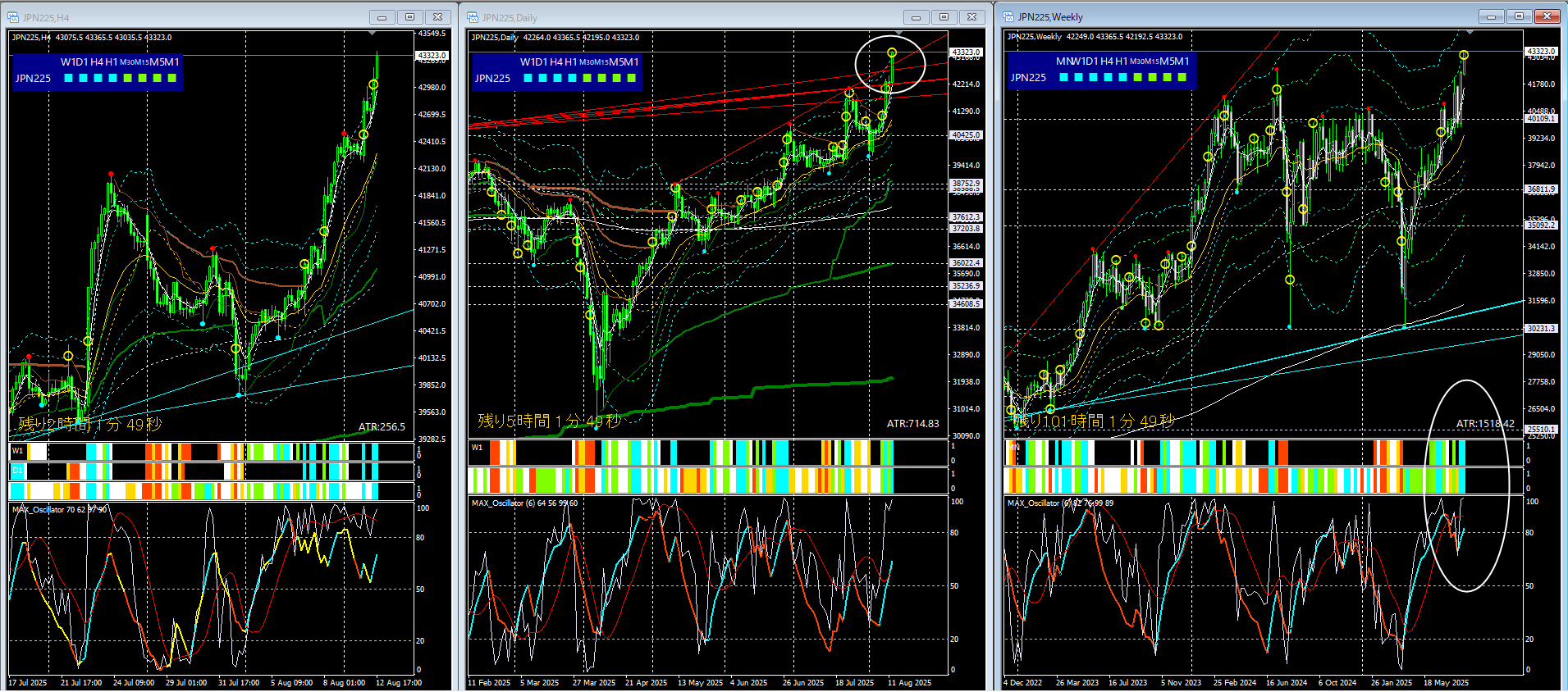 一方で、週足のMAXオシレーター、シンクロバンドは「強い上昇」を示唆