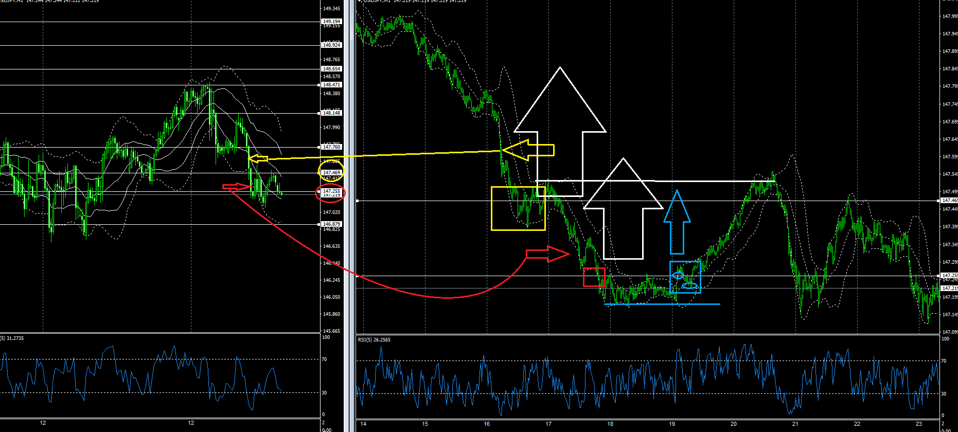 1時間足を見てレンジを下抜けした場合、一旦リバ入るだろうと14746ラインを起点にタッチ後Lポジ取る戦略でいました。