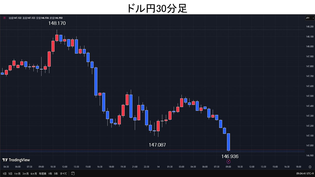 東京時間、ドル円は、日経平均が連日で史上最高値を更新した事や、本邦実需勢のドル買い観測などで148.17円まで上昇。その後、本邦長期金利が上昇したことで上値が重くなり147.80円台まで下押し。欧州時間、欧州勢がドル売りで参入すると、ドル円は前日安値147.57円を割り込み147.18円まで下落。NY時間、ベッセント米財務長官が「米金利は今より1.50-1.75%低い水準にあるべき」「9月の0.50%利下げの可能性は高い」と発言すると、米早期利下げ観測が高まりドル売りが先行。更に、ベッセント氏が植田日銀総裁と会談した事を明らかにし、「日本はインフレ問題を抑える必要がある」と述べると日銀に利上げを促したのではないかとの思惑で円買いが先行。ドル円は147.08円まで安値を更新。