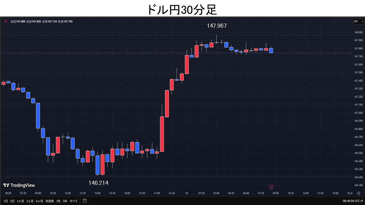 ドル円、一時146円台前半まで下落後、米PPI予想上振れで147円台後半へ上昇。