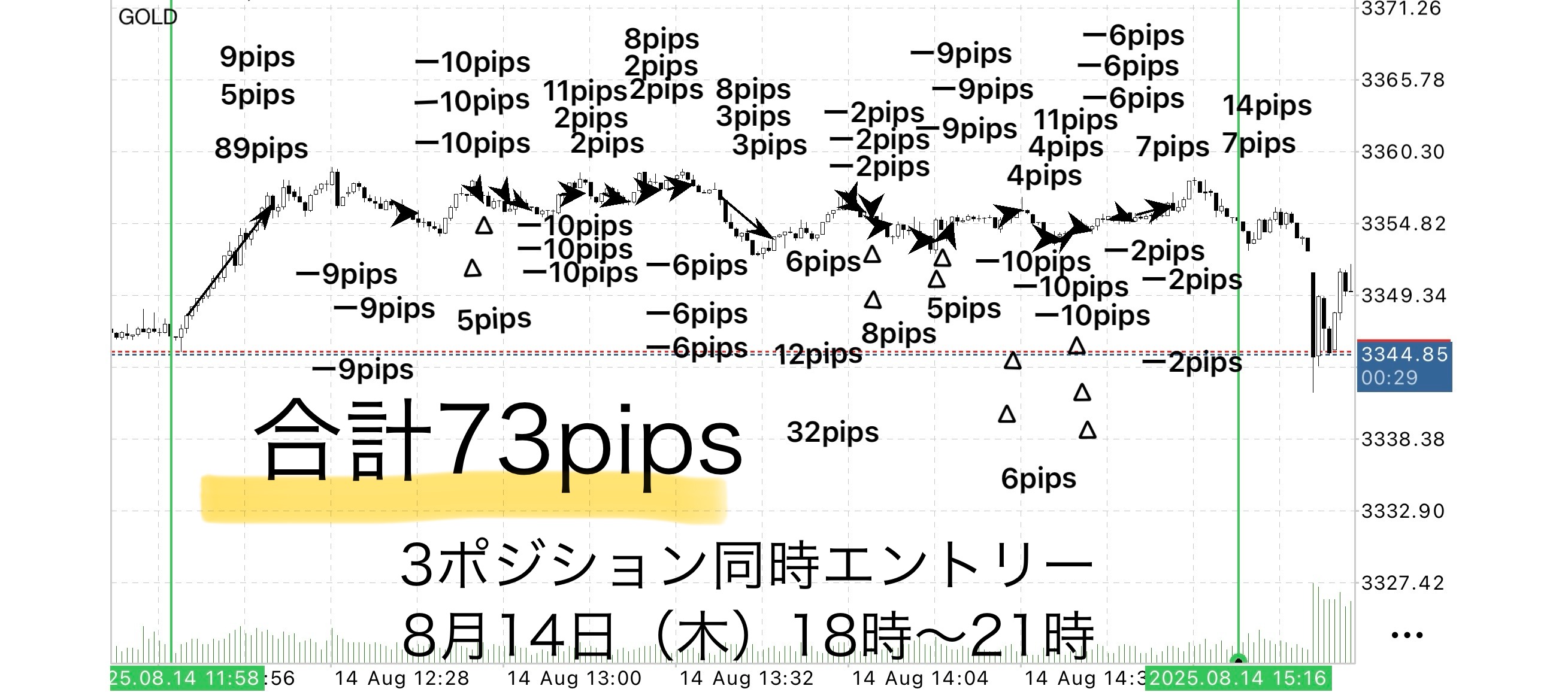 【第80回】一見複雑そうで実はシンプルな3ポジショントレード/+73pips(約105,800円)/GOLD 1分足