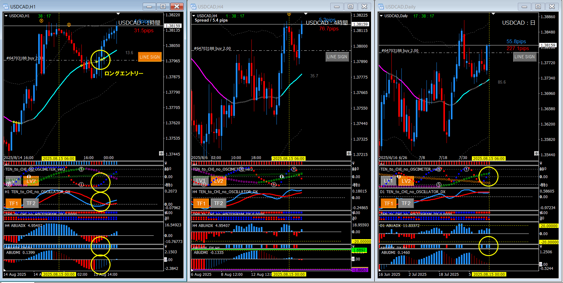 今回は日足のABUADX_DXの点灯を根拠に1時間足でロングエントリーポイントを探します。1時間足で複数のエントリー根拠が同タイミングで出ている箇所(黄○の部分)がありますね。非常に優位性の高いポイントなので積極的に狙っていくと良いです。