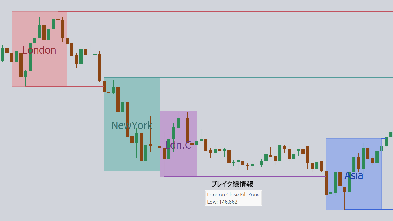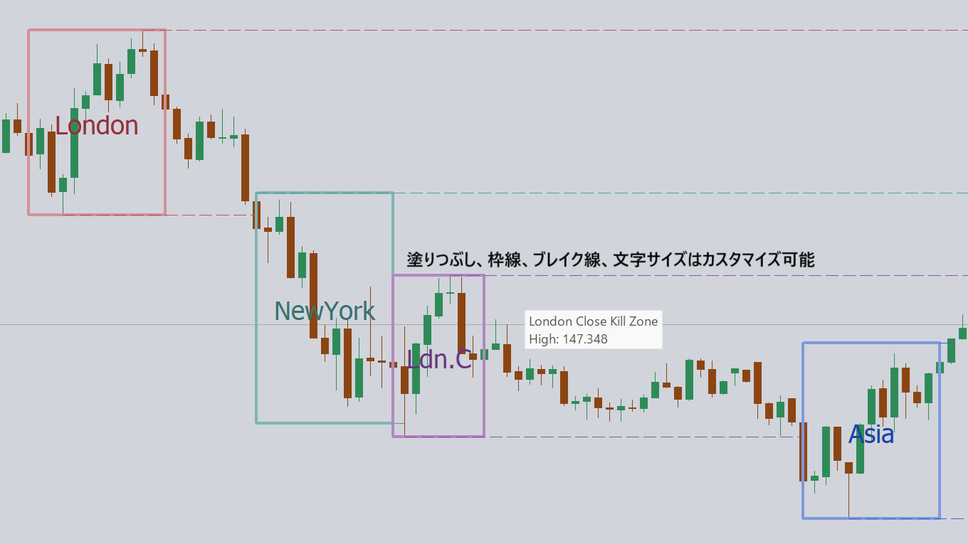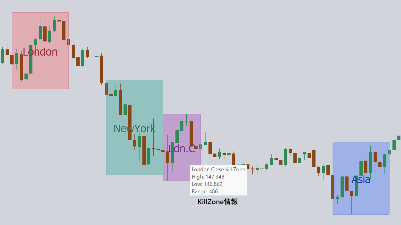 ICT Killzonesインジケータは、アジア・キルゾーン、ロンドン・キルゾーン、ニューヨーク・キルゾーン、ロンドン クローズ・キルゾーンの4つの時間帯をリアルタイムに表示し、潜在的な取引機会を提供します。