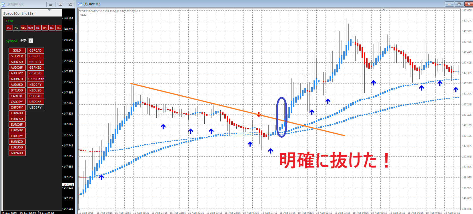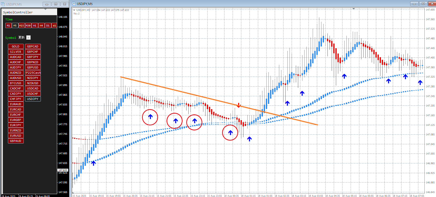 5分足で1波を形成後、3波を狙うためにエントリータイミングを見ていた場面です。