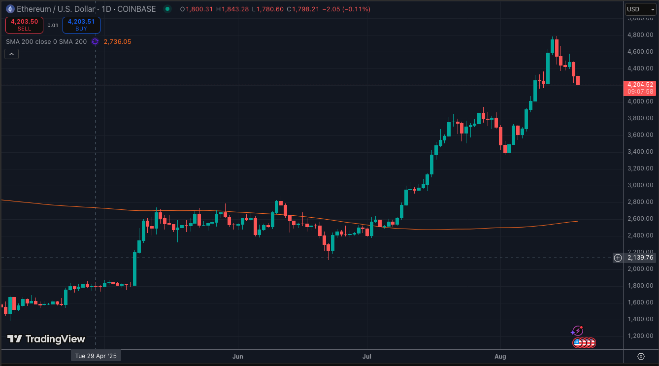 現在は一時調整により、ビットコイン以上に下落が大きく4800ドルから4200ドルに落ち込んでいます。