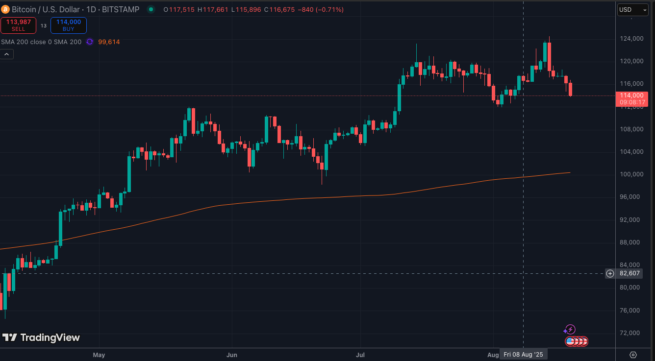 ビットコインは先週の最高価格124000ドルから大きく下落し、現在114000ドルの水準となっています。この水準は8月初旬の水準です。