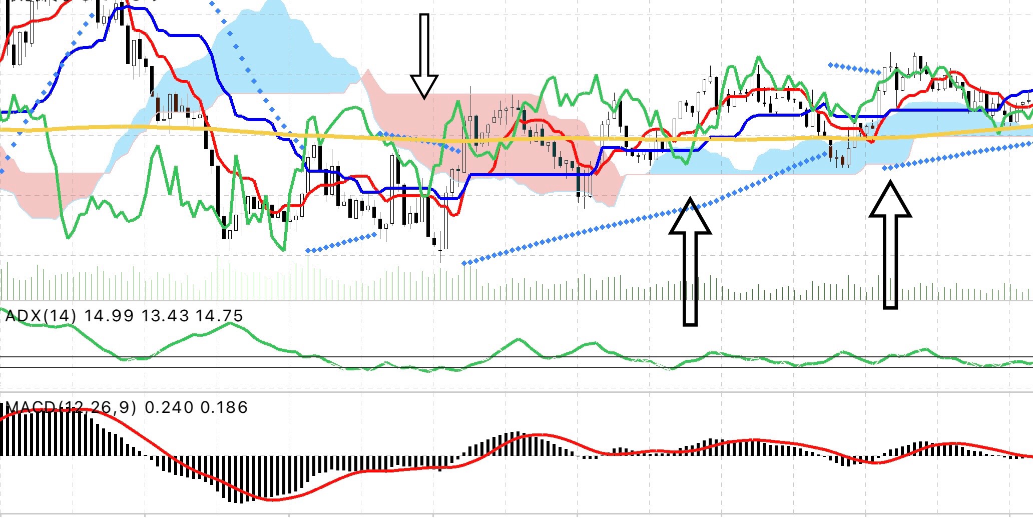 それは「移動平均線・RSI・MACD・ストキャスティクス・パラボリックSAR・ADX・ATR・CCI・一目均衡表」など、あらゆるテクニカルを重ねてチャートを埋め尽くしてしまうことです。