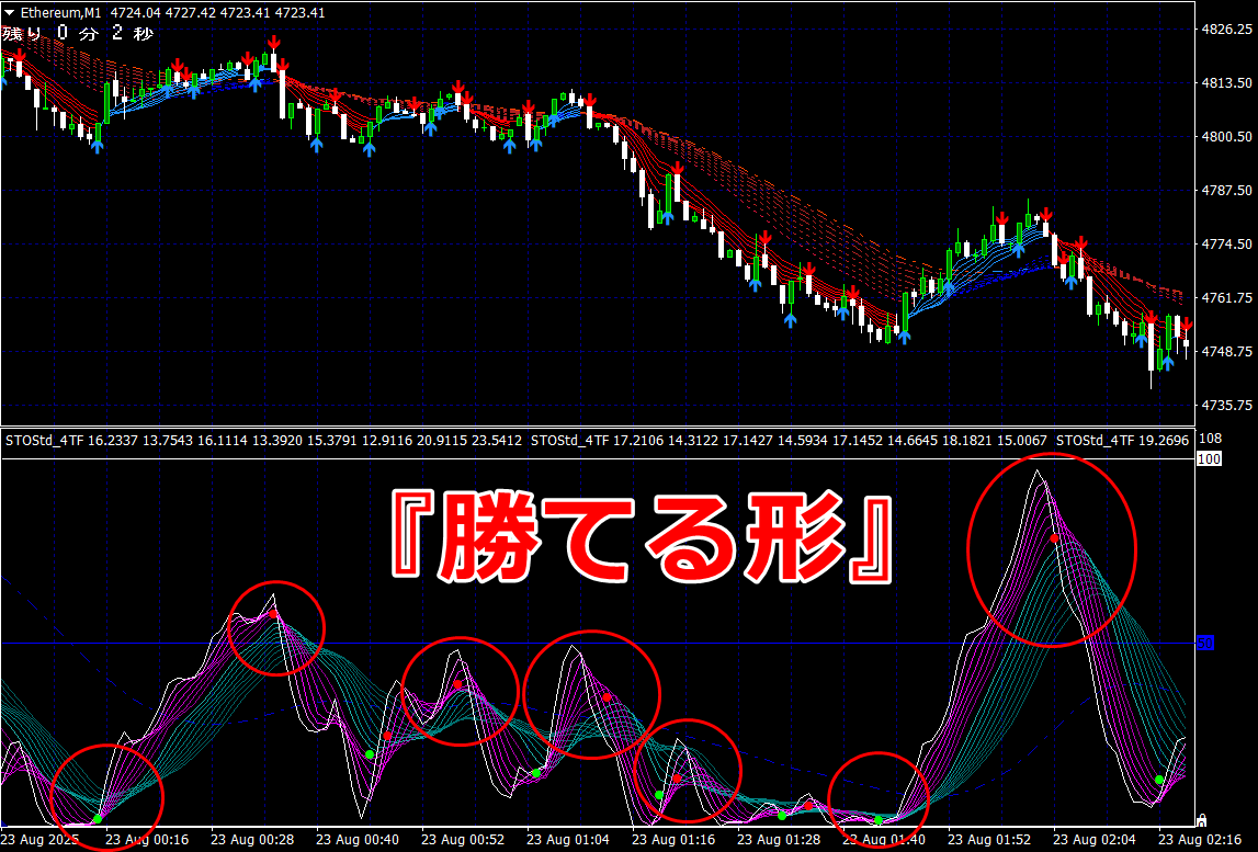 ② 矢印サイン点灯状態で、インジケーターのピンク色の帯が、緑の帯を下からすくい上げるような形状であれば、現在のローソク足が確定する数秒前か確定の直後に1分判定または3分判定でハイエントリーします。