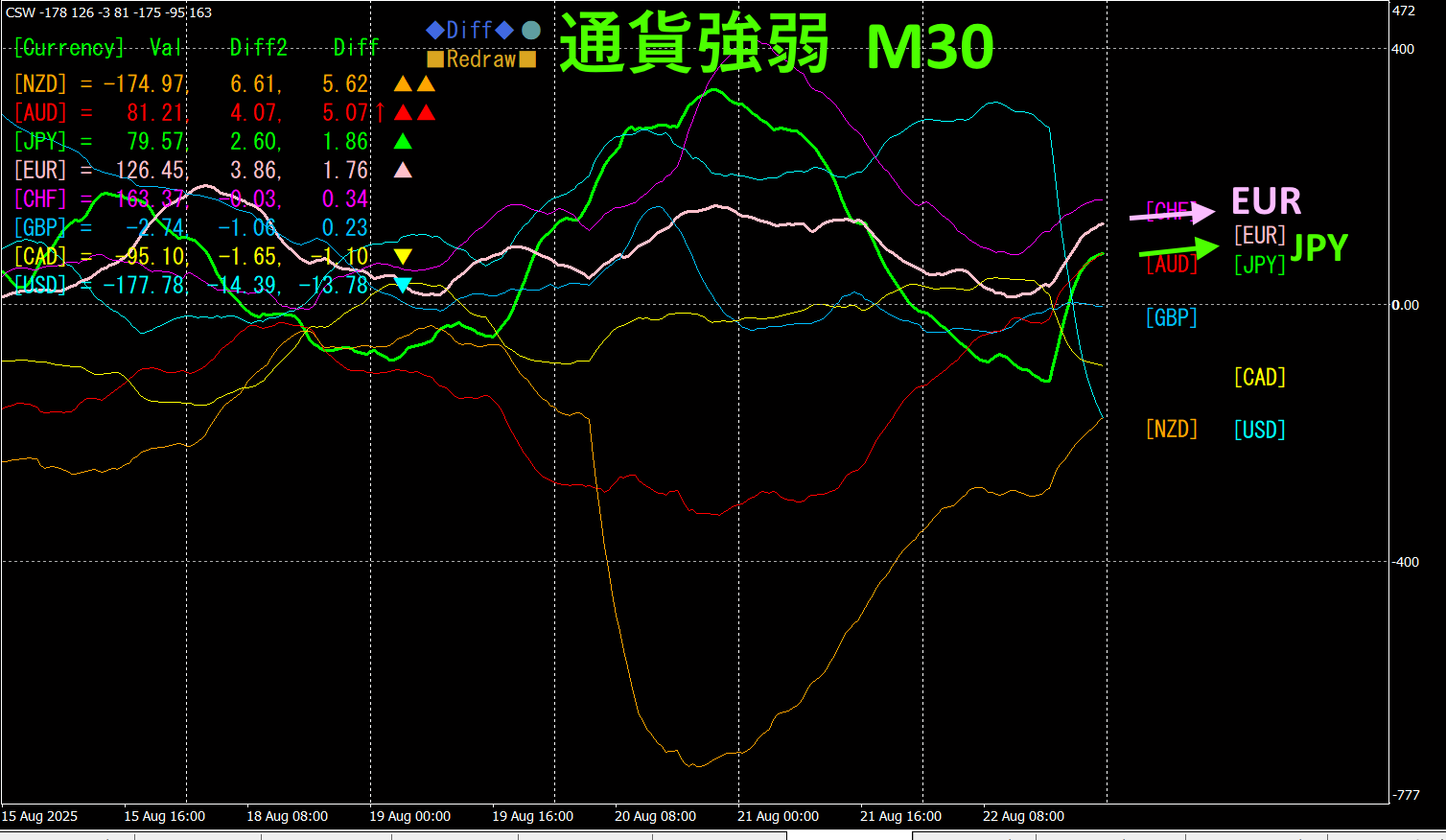 ピンク色がEUR、緑色がJPYです。M30チャート上では、EURもJPYも、やや上向きです。EURJPYにはっきりした方向感が出ていません。EURJPYは、暫くはレンジ状態で推移すると考えられます。