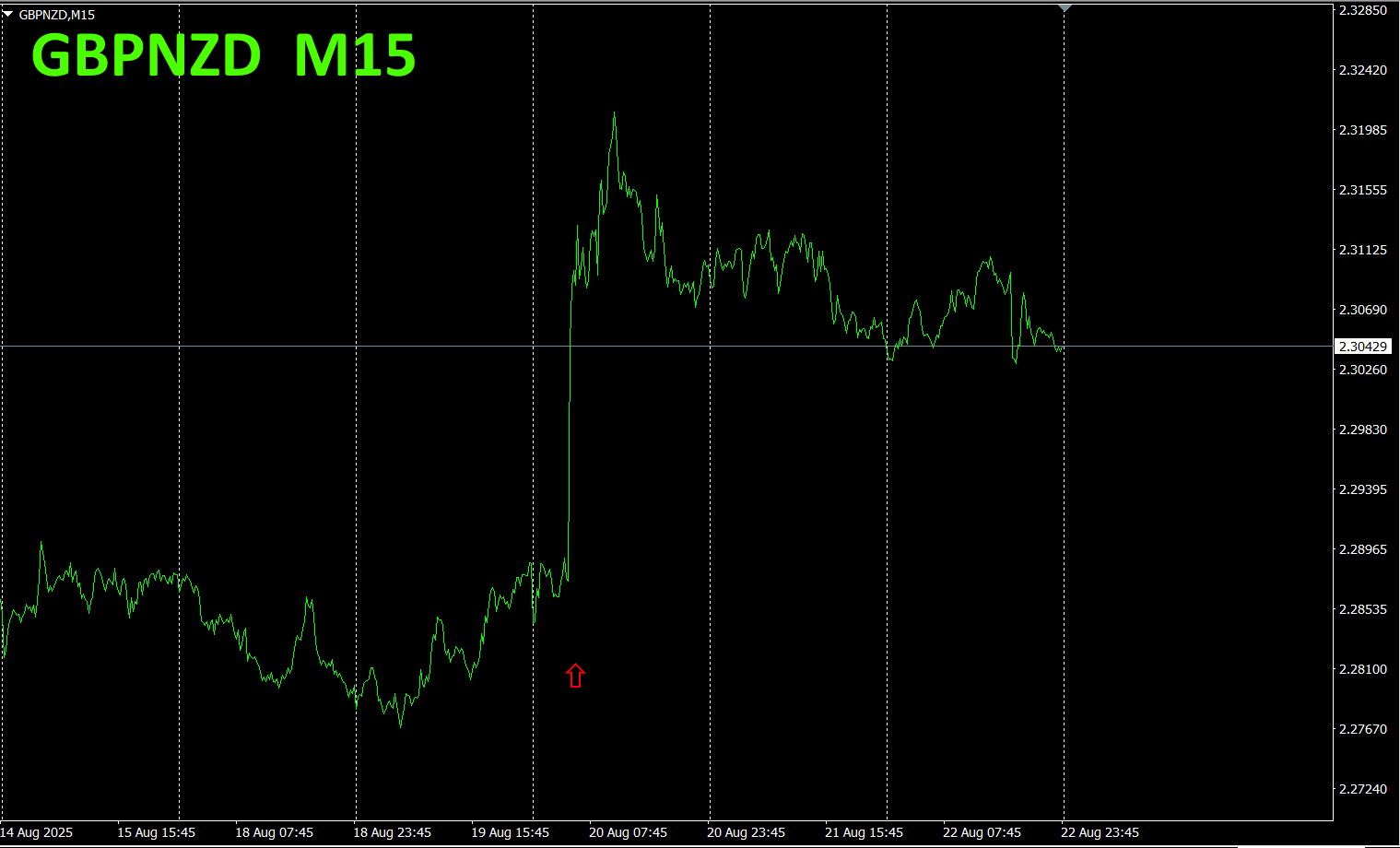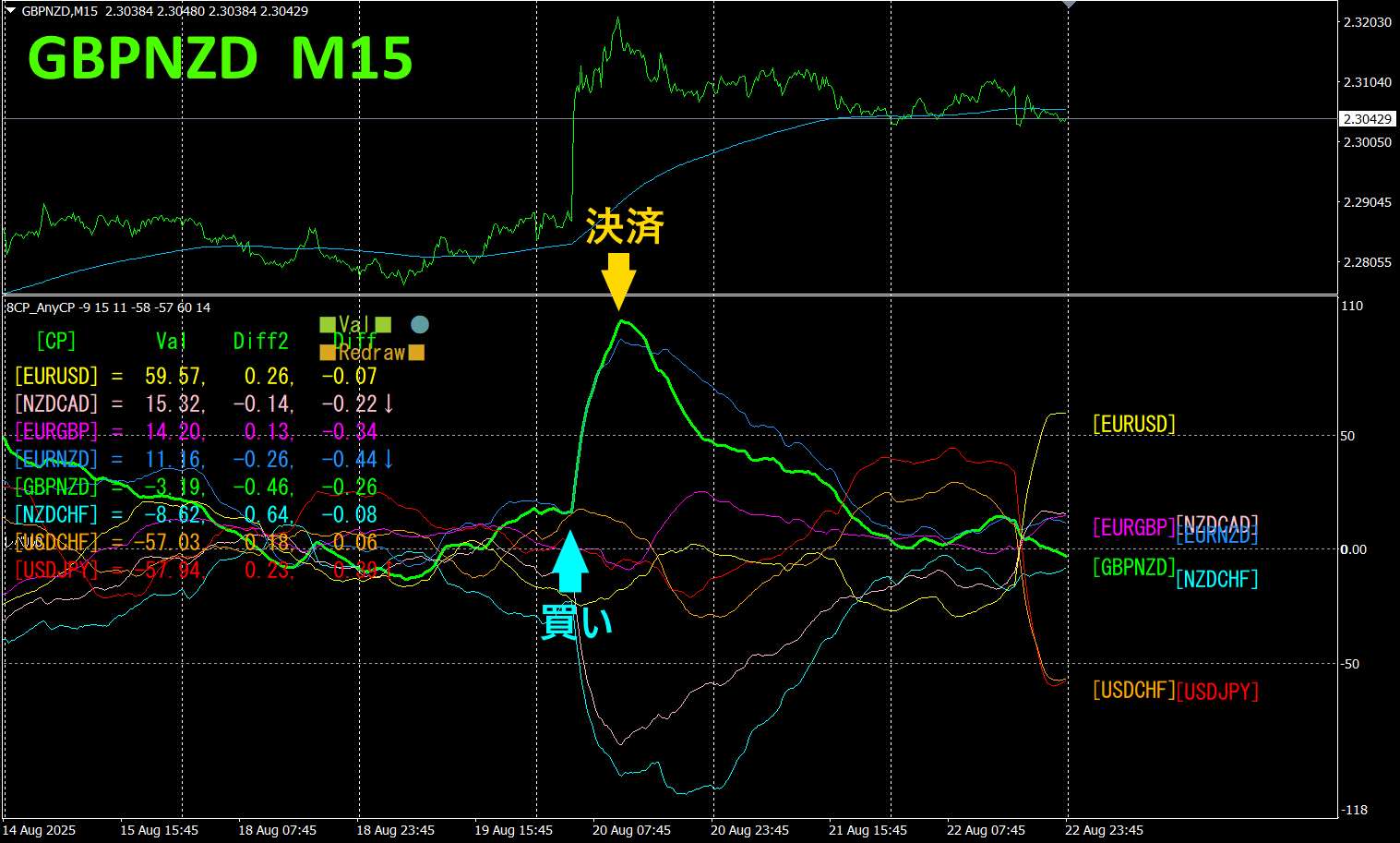 上半分は、GBPNZDの15分足チャートです。下半分は、「8CP見える化インジケータ」によるものです、緑色太線のグラフがGBPNZDに相当します