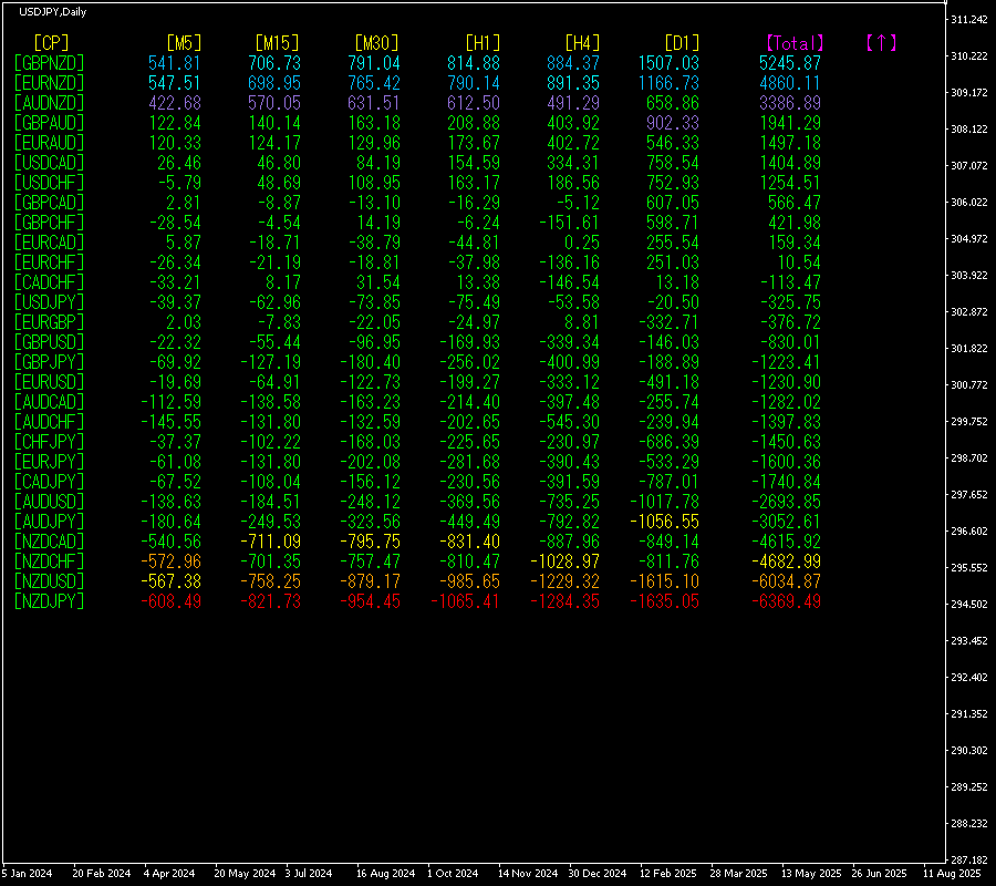[Total]数値の降順に並んでいます。一番上にあるGBPNZDは、全ての時間足で青色系の表示色になっています。Total数値が+5245.87と、大きいプラスの数字になっています。GBPNZDに著しい上昇トレンドが発生していることが示されます。