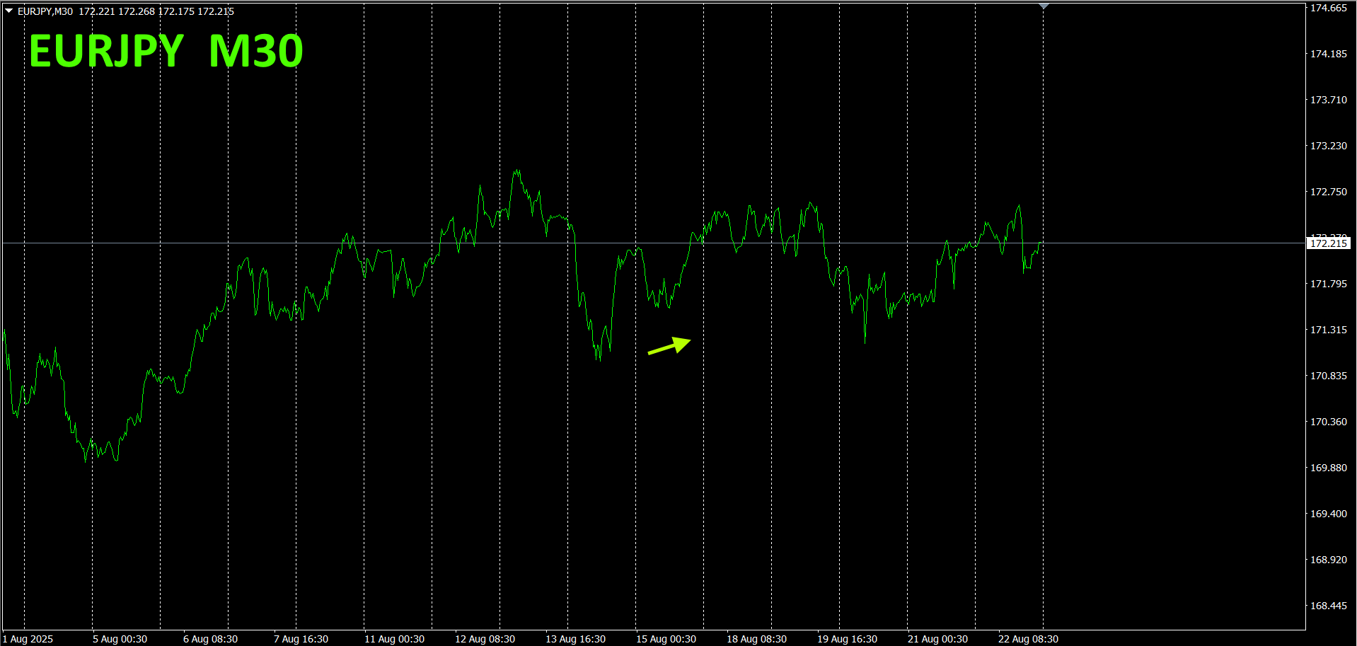 ピンク色がEUR、緑色がJPYです。M30チャート上では、EURはやや上向き、JPYはほとんど水平方向になっています。EURJPYにはっきりした方向感が出ていません。EURJPYは、少しだけ上昇気味に進むと考えられます。