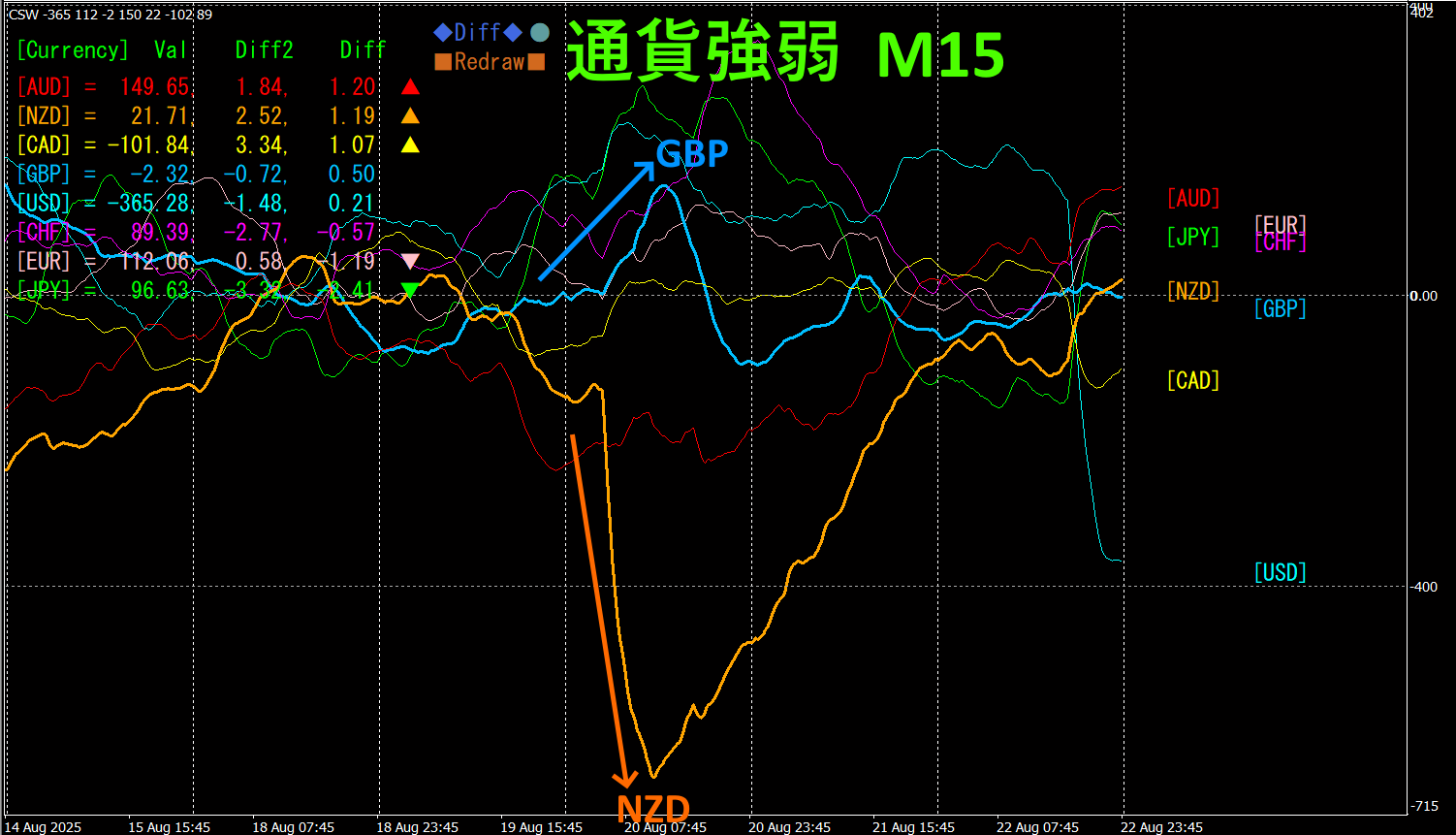 15分足の通貨強弱グラフを見ると、GBPとNZDが、見事な逆相関関係になっていることがわかります。GBPとNZDが収束から拡散に向かう時に、GBPNZDを買えば、利益が得られます。今一番大きく伸びていて、逆相関関係にある通貨ペアを選びトレードすれば、自ずと結果が付いてくるのです。