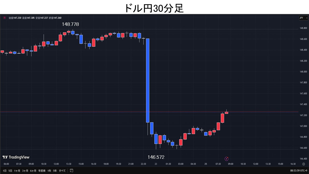 パウエルFRB議長のハト派発言で、ドル円は一時146.57円まで下落。