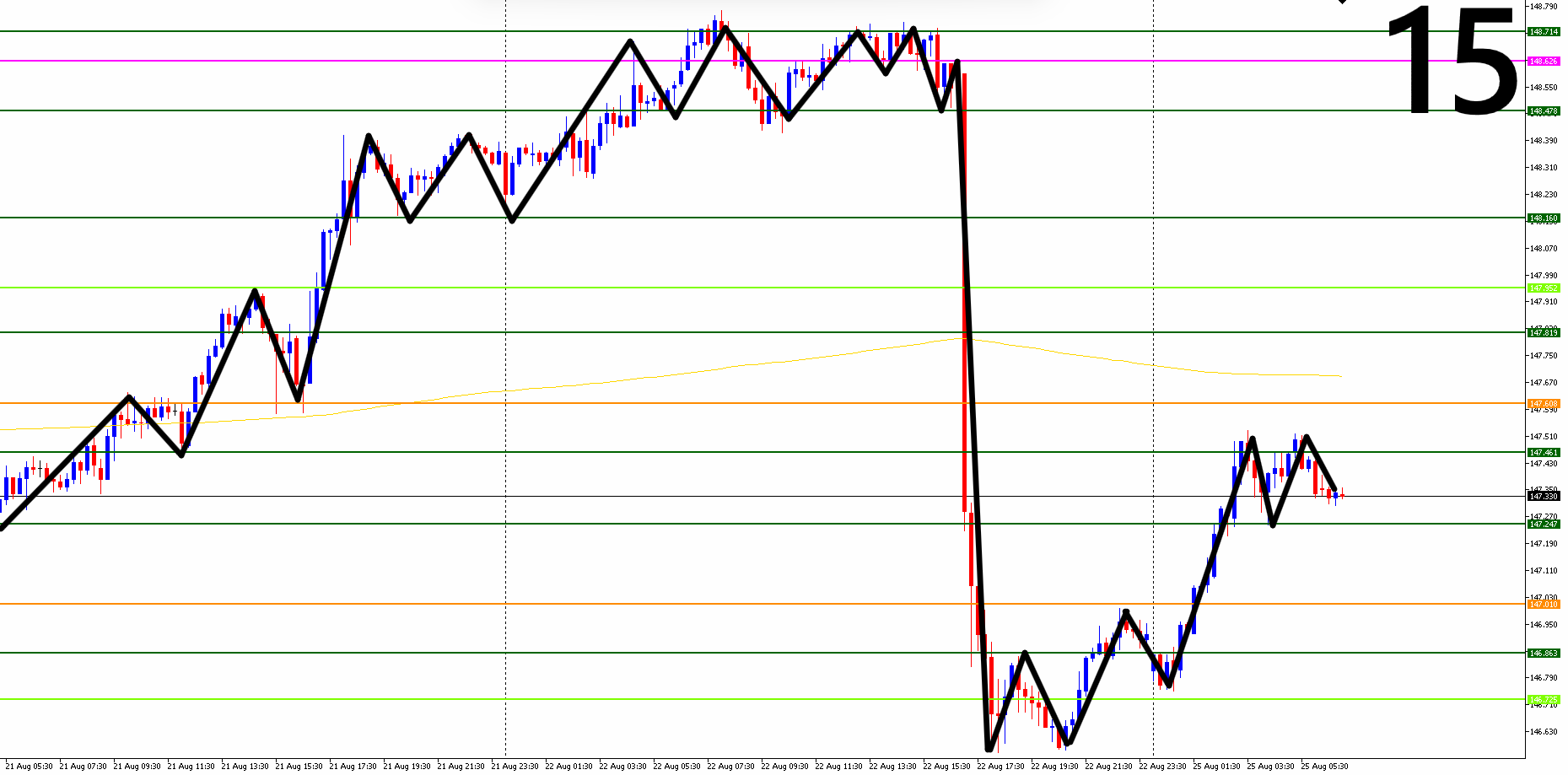 ●日足・4時間足・1時間足・15分足までの相場を水平線と波動(ダウ理論)を使って環境認識し、勝率の高いエントリーポイントを3つに絞る