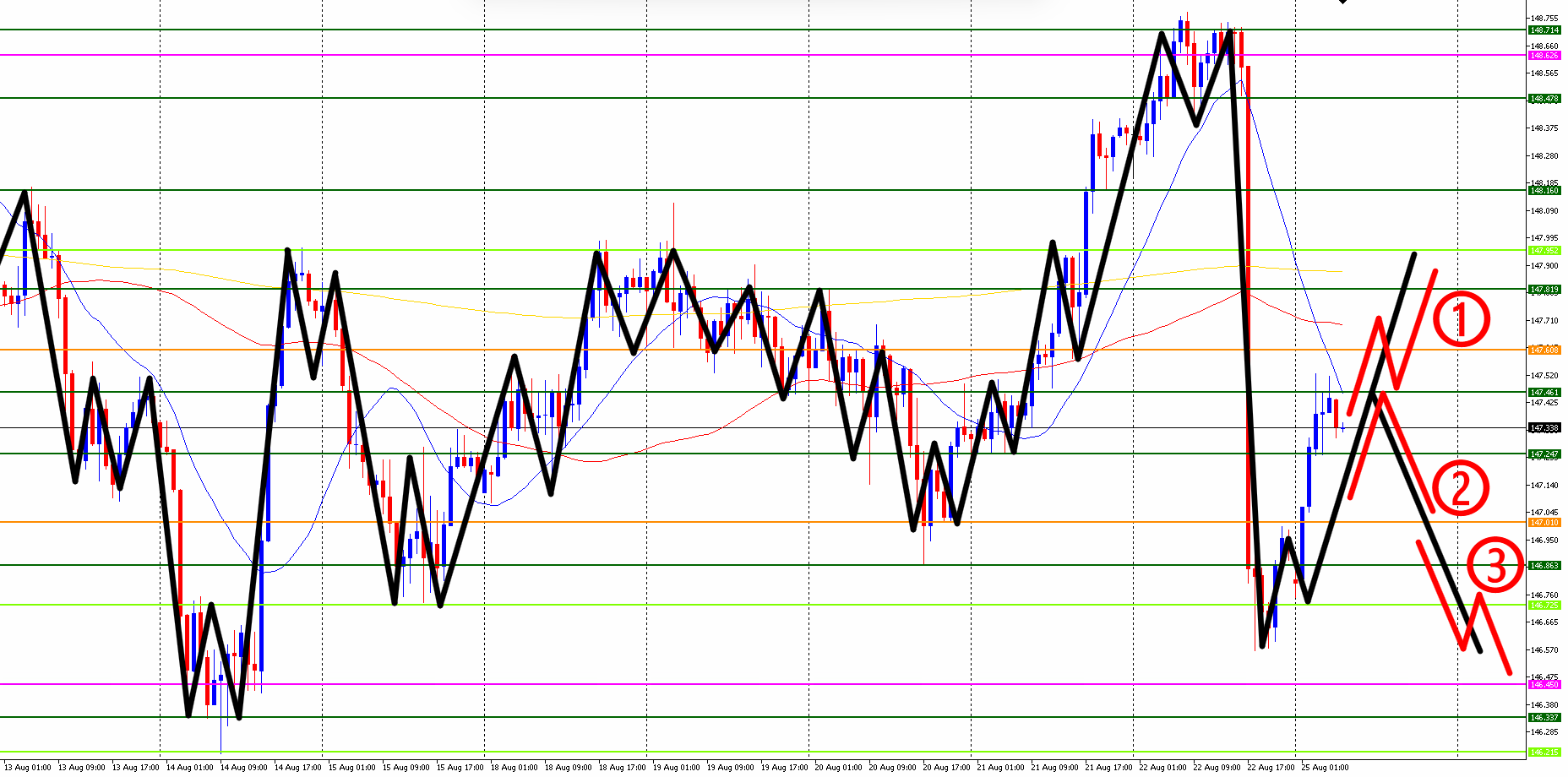 【赤丸②】147.461円あたりが機能すれば1時間足レベルでの戻り売り。