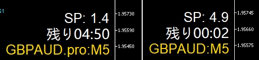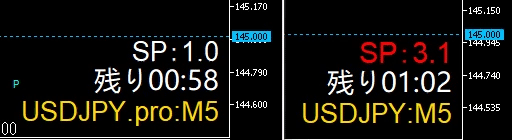 こうやってチャートの片隅に数字で表示してくれていればエントリーの直前に確認できますし、さらには警告機能として設定値以上にスプレッドが開いてしまった場合は文字の色や大きさを変えることもできるようになっています。