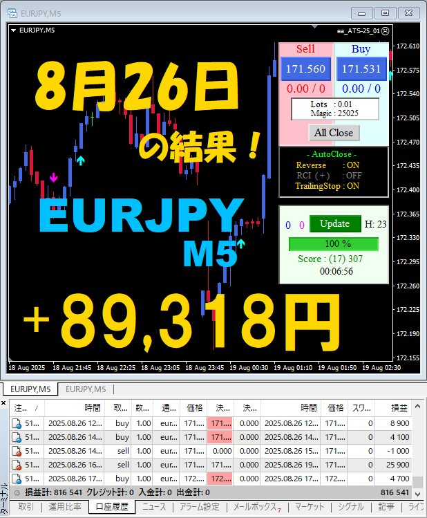 【前日の結果】EURJPY M5 『ATS-25』8月26日