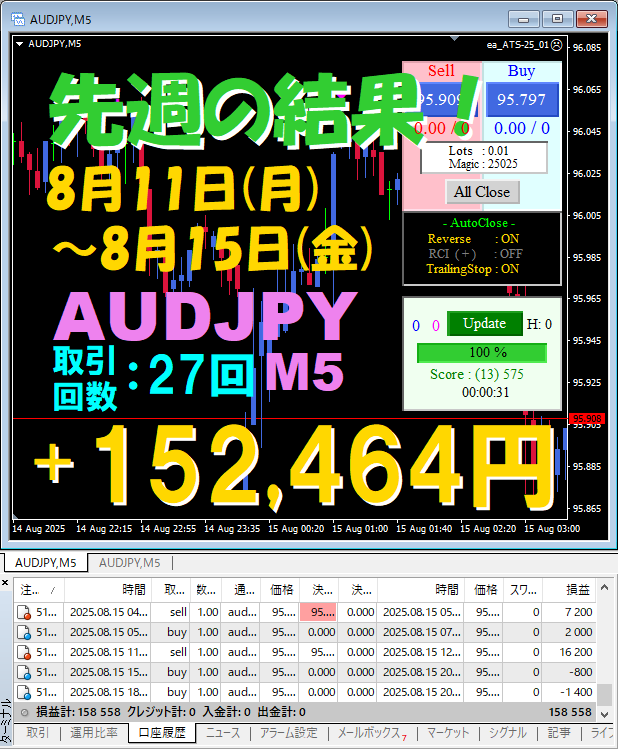 【先週の結果】AUDJPY M5 『ATS-25』8月11日(月)~8月15日(金)